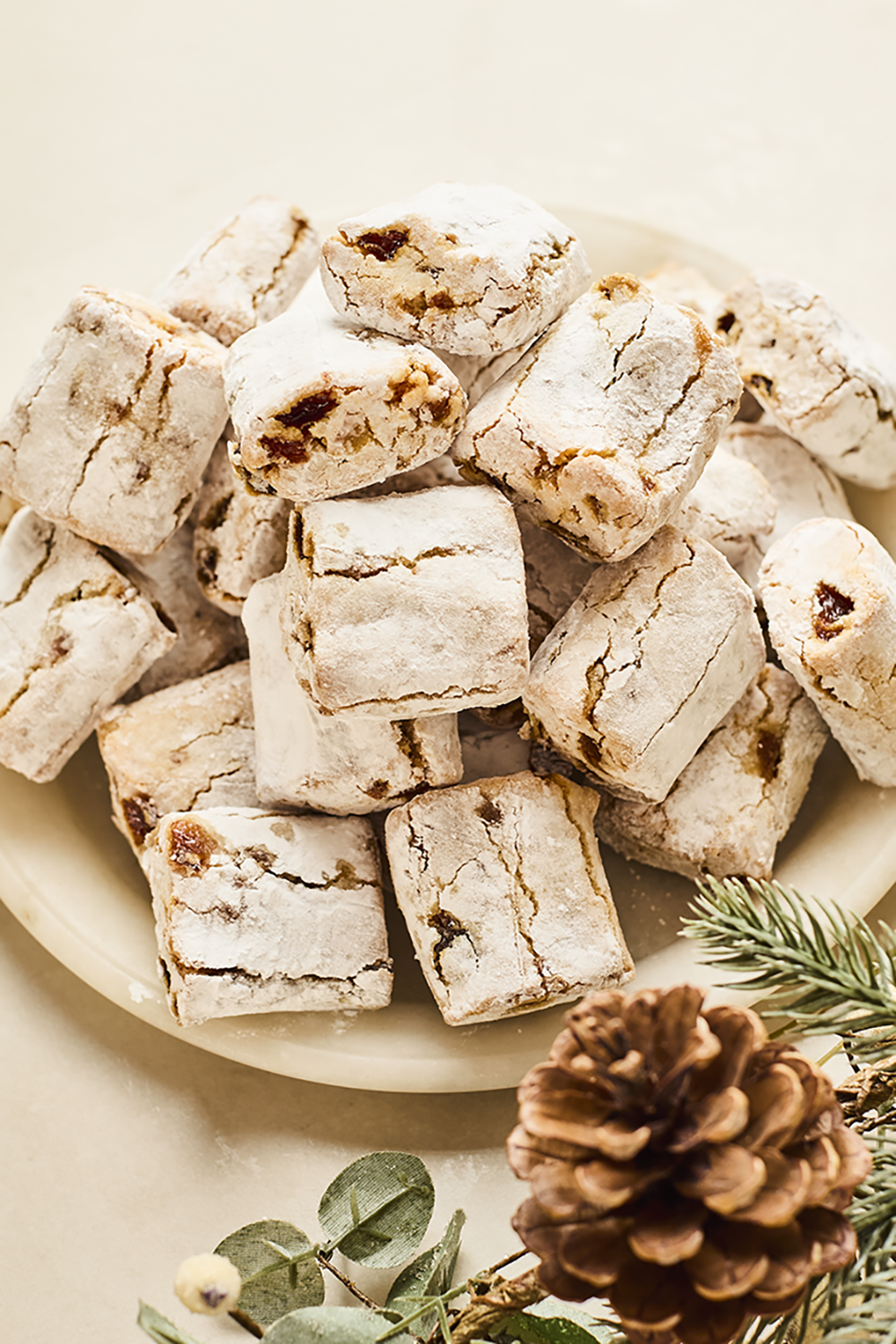 Soft and chewy almond biscuits from Tuscany. Made with ground almonds, candied orange peel and sultanas, then baked to crackled perfection.