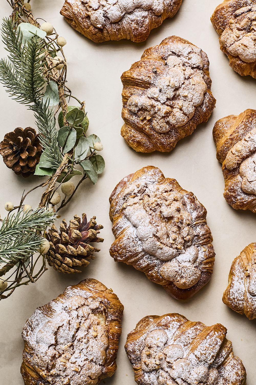 A croissant with a festive twist. Brushed with a spiced syrup of clove, nutmeg and star anise, filled with a rich gingerbread frangipane made from black treacle, almonds, and warm mixed spices. Finished with roasted hazelnuts.